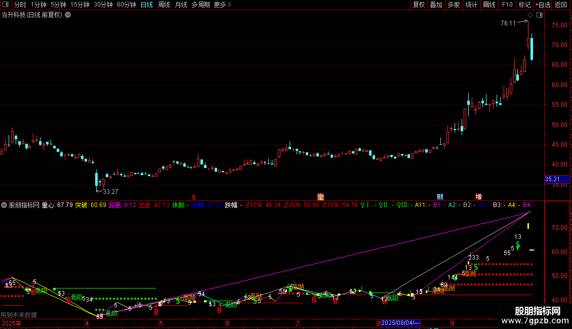 输出B4:当满足条件最低价<=55日内最低价的最低值时,在最低价位置画直线起点,当满足条件最高价>=55日内最高价的最高值时,在最高价位置画直线终点,0表示是否延长.