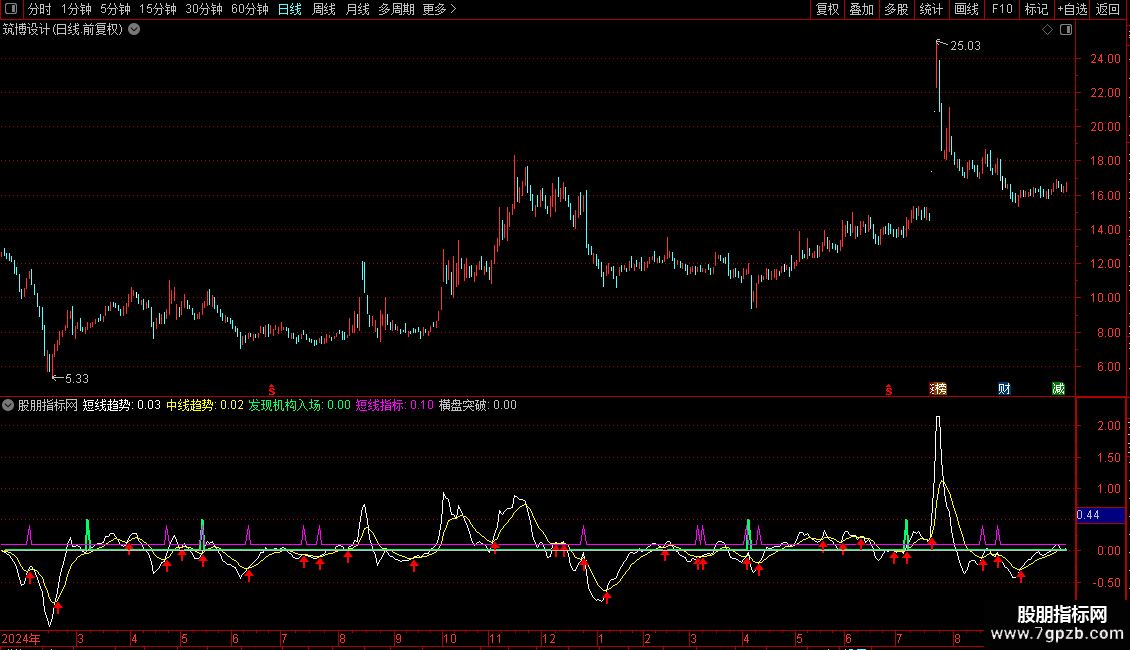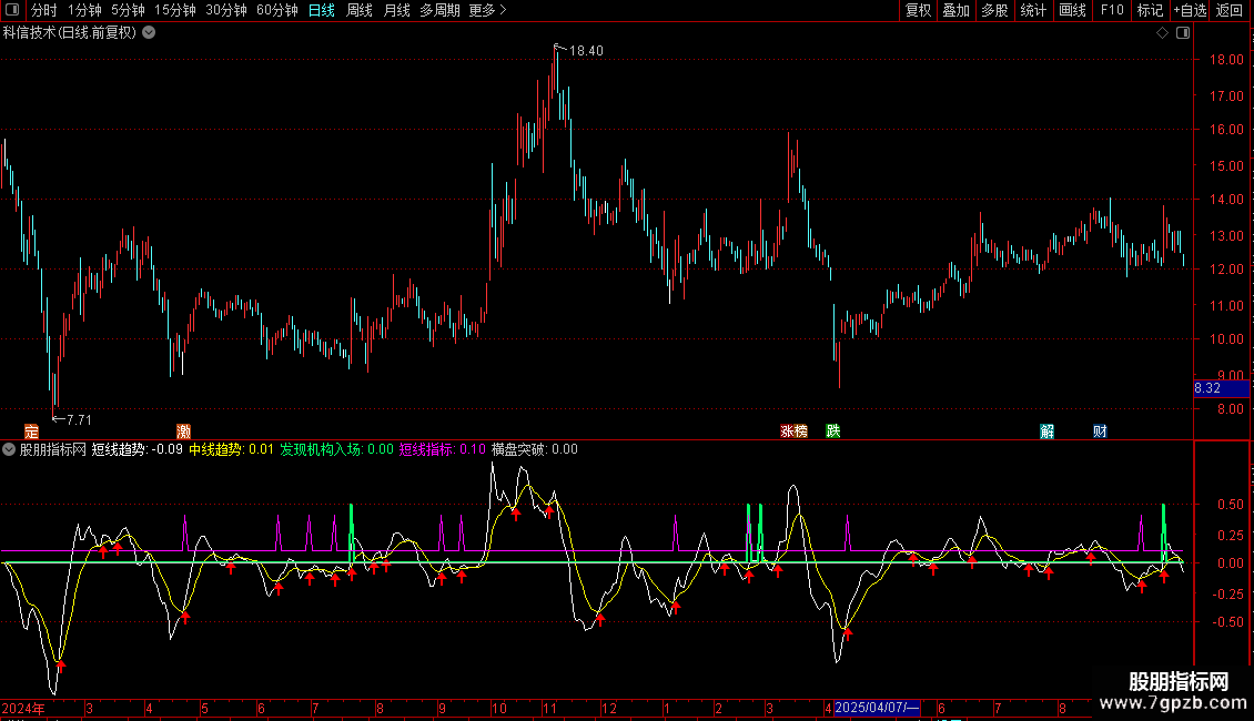 短线指标:IF(((((CROSS(短线趋势,中线趋势) AND (短线趋势 < 0)) AND (中线趋势 < (0 - 0.2)+4)) AND (VAR11 > 45)) AND (VAR16 > 0)),0.4,0.1),COLORMAGENTA;