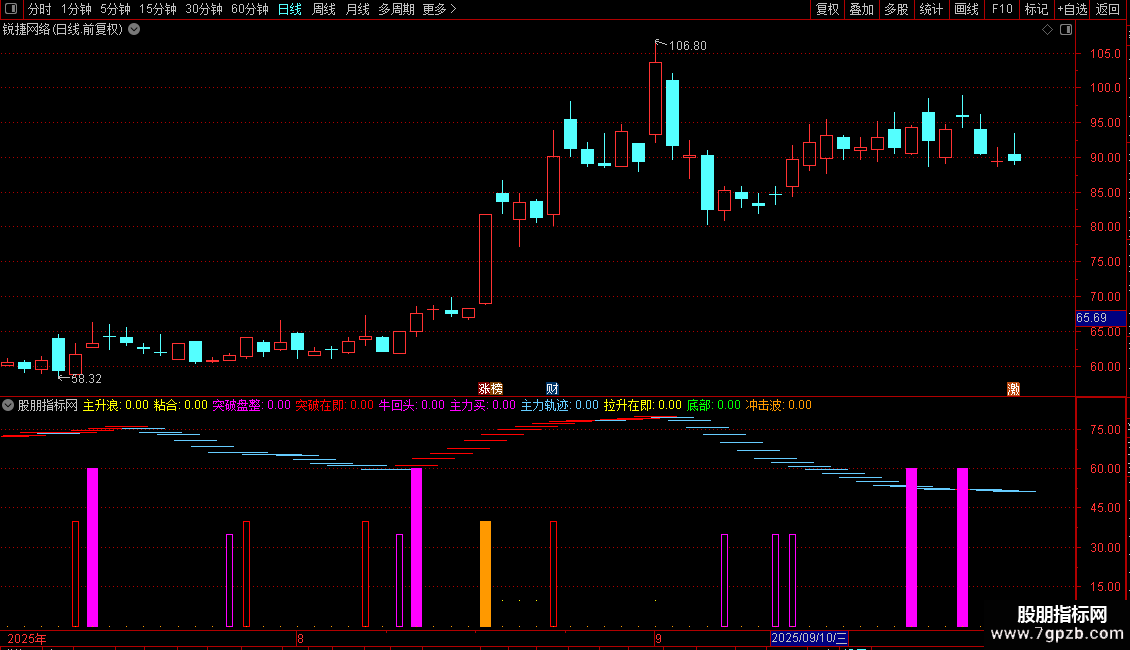 主力买:IF(短中精,60,0),COLORFF00FF,POINTDOT;