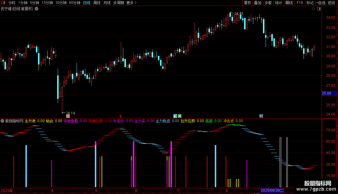 牛回头:IF(U3 OR U4,35,0),COLORFF00FF,POINTDOT;