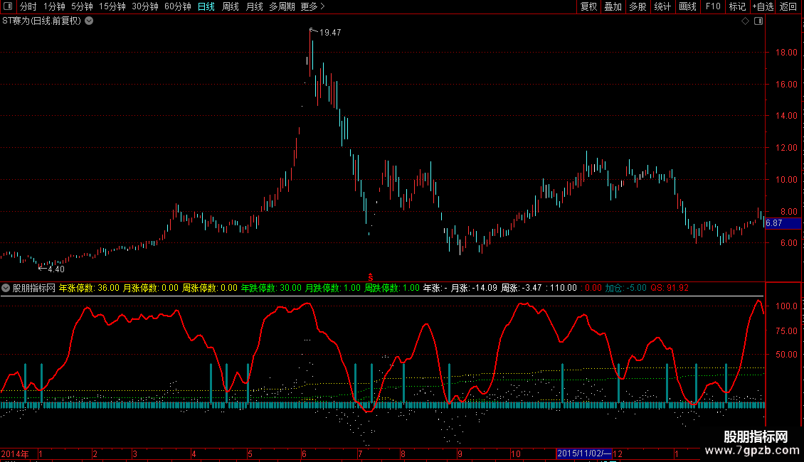 周跌停数:SUM(ZDF<-9.8,WEEKDAY),POINTDOT,COLORGREEN;