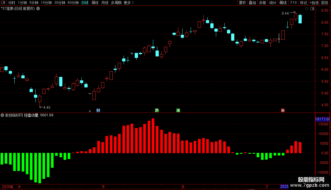STICKLINE(控盘动量>0,控盘动量,0,2,0), COLORRED;