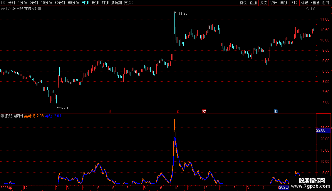 黑马线:IF(LS28>0.1,LS29,0)*5,COLOR0066FF,LINETHICK2;