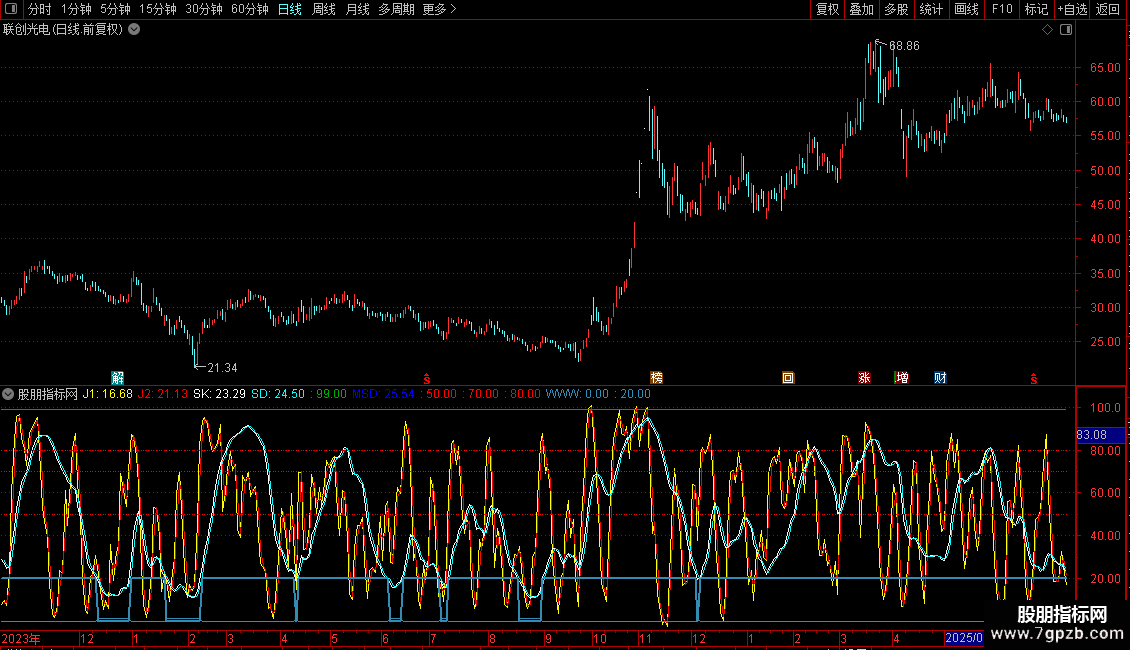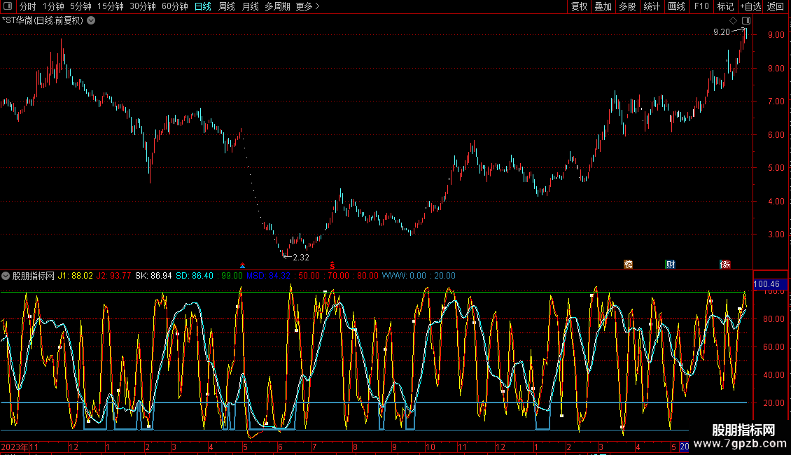 SD: EMA(0.667*REF(SK,1)+0.333*SK,1),COLORCYAN,LINETHICK1;
