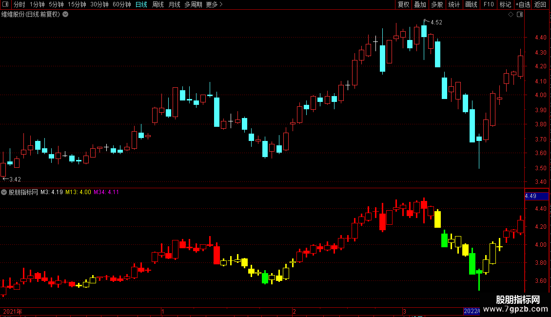 STICKLINE(M3<M13 AND M34>=REF(M34,1) ,H ,L ,0.1 ,0 ),COLORYELLOW;