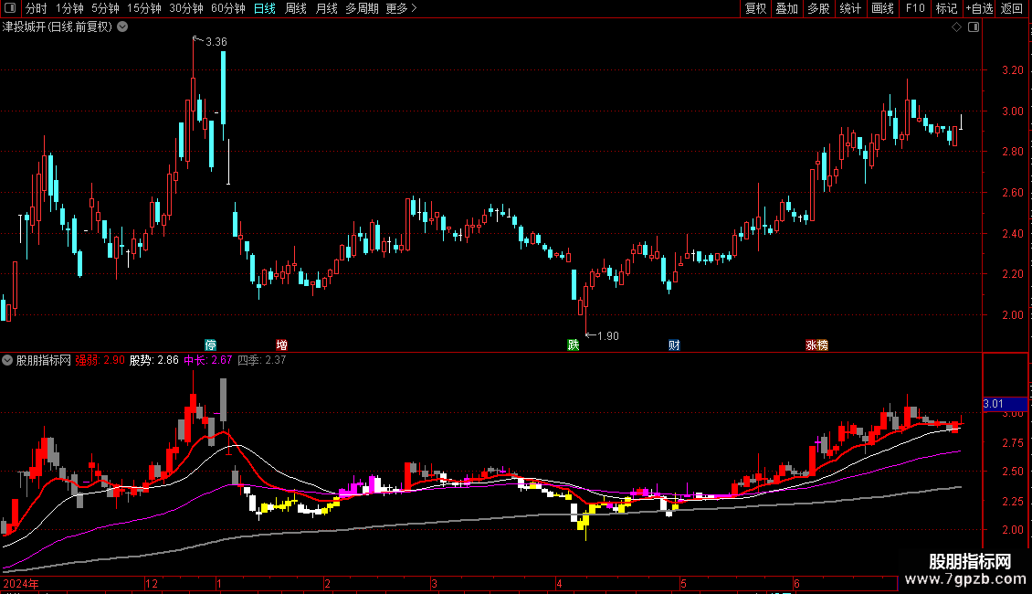 强弱:(MA(VAR1,3)+MA(VAR1,6)+MA(VAR1,12)+MA(VAR1,24))/4,COLORRED,LINETHICK2;