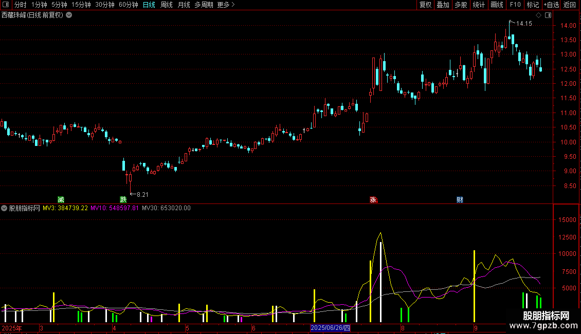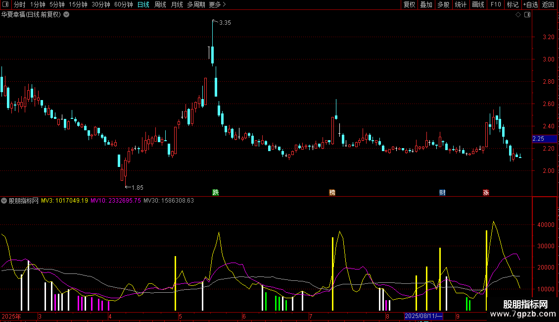 输出MV3:成交量(手)的3日简单移动平均线宽为1,COLOR00FFFF