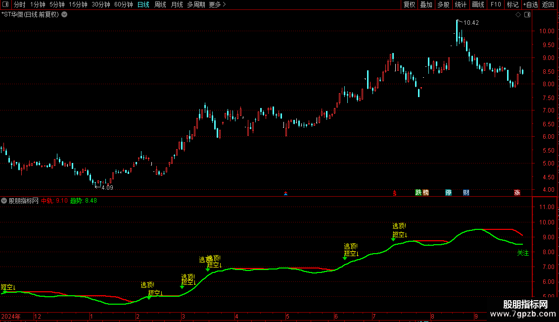 DRAWTEXT(CROSS(84,RSI) , HIGH*1.06,'逃顶!'),COLORYELLOW ;
