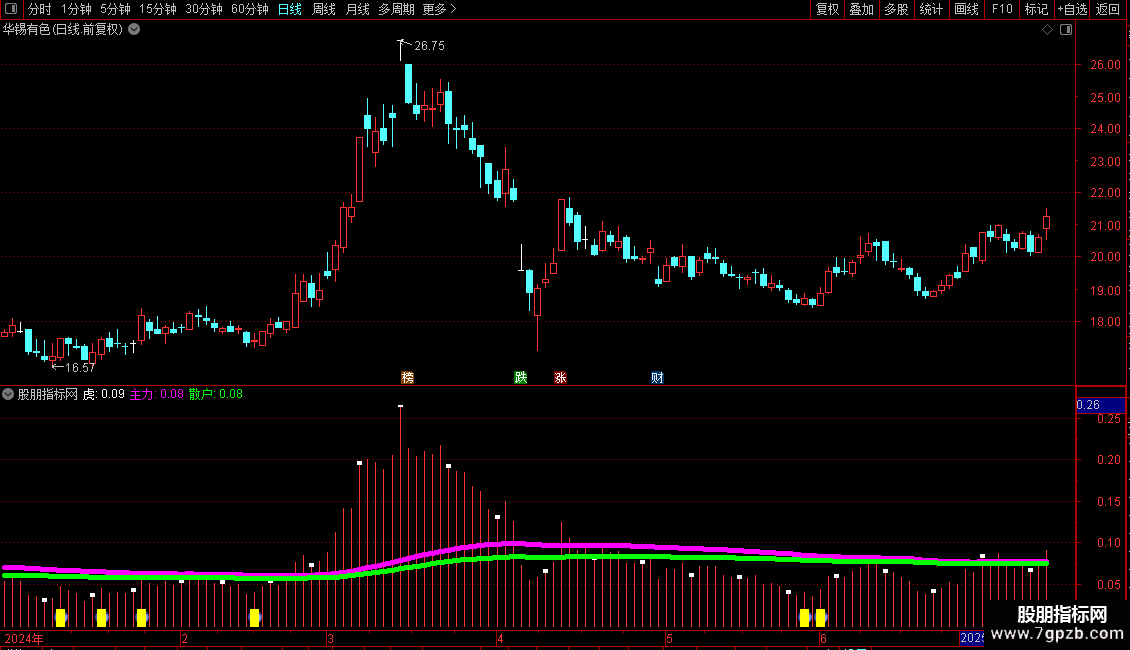 主力:EXPMA( (EXPMA(CLOSE,500)-REF(EXPMA(CLOSE,500),1))/REF(EXPMA(CLOSE,500),1)*100,120)-0.0004,LINETHICK5,COLORMAGENTA;