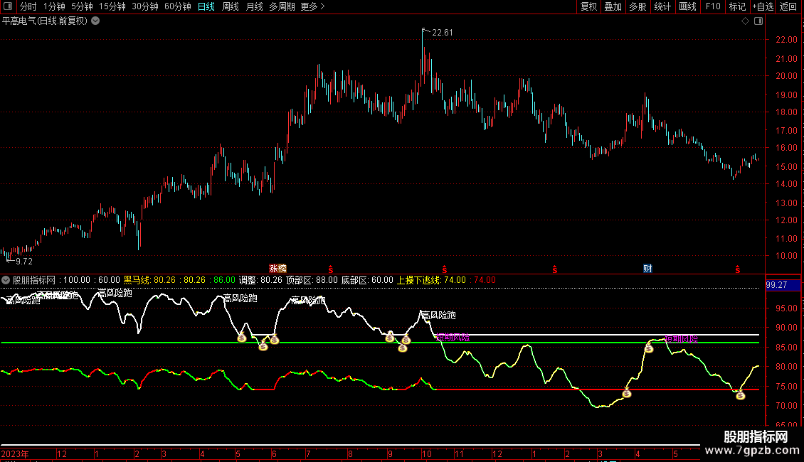DRAWTEXT(VAR9 AND VAR7<88,调整,'短期风险'),COLORF00FF0;