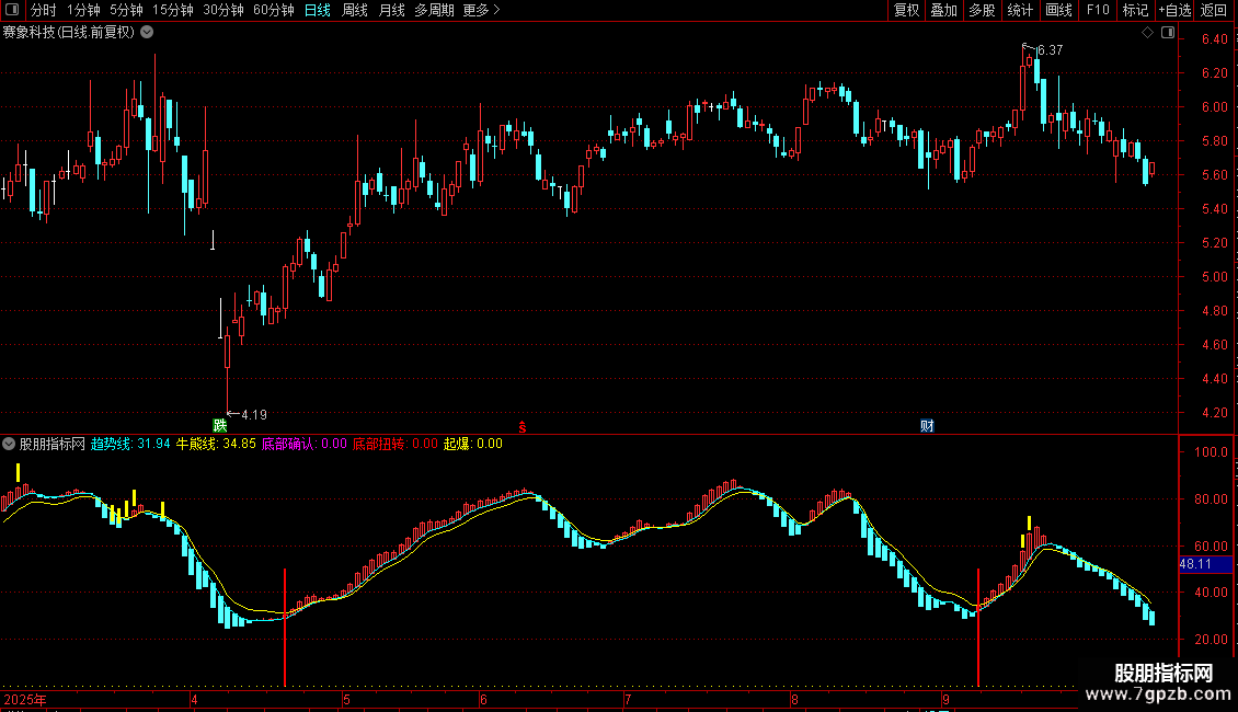 紫色柱状线:代表底部确认信号,表明股价可能已处于底部区域。