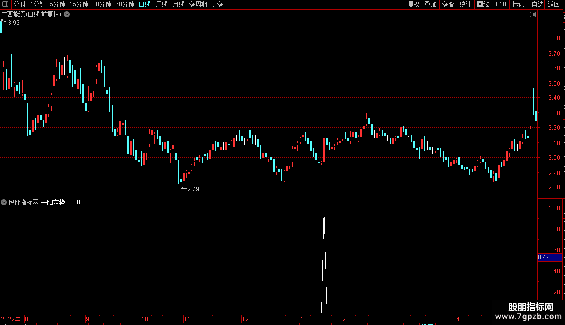 一阳定势:(C>VAR46&&O< VAR47&&量比>1&&crOSS(多方力度,空方力度)&&C/REF(C,1)>1.02)*1;