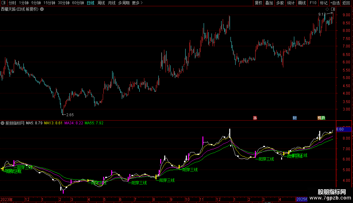 DRAWTEXT(一阳穿三线,L-0.1, '一阳穿三线'),COLORGREEN;