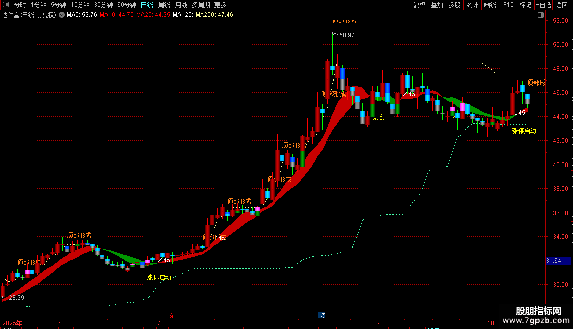 支撑:MA(REF(LLV(C,30),1),2),COLORABFF46,DOTLINE;