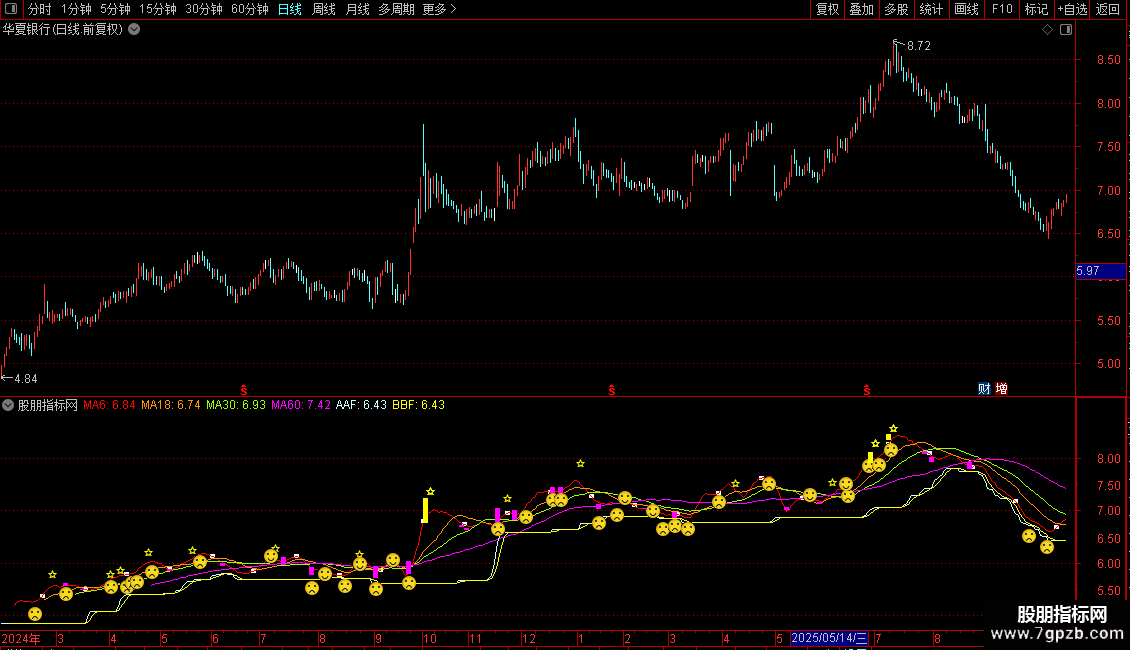 DRAWICON(CROSS(操盘线,V5) AND MA6>REF(MA6,1),L,4);