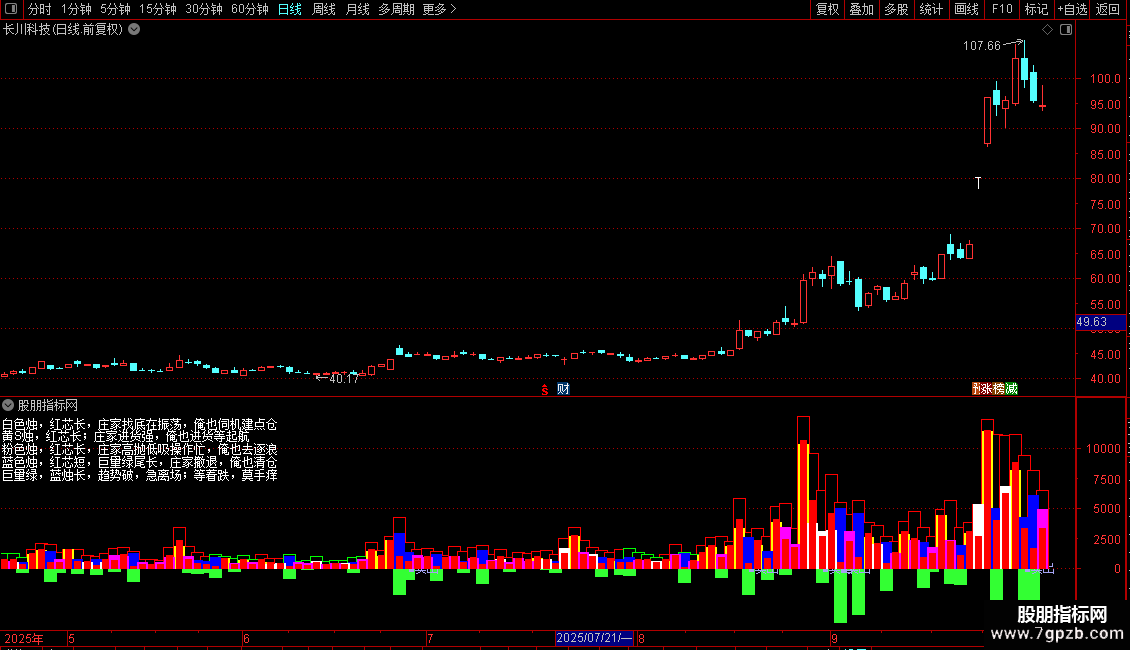当满足条件((VAR7>VAR6)AND(VAR7>VAR8))时,在0和VAR7位置之间画柱状线,宽度为4,0不为0则画空心柱.,COLORFF00FF