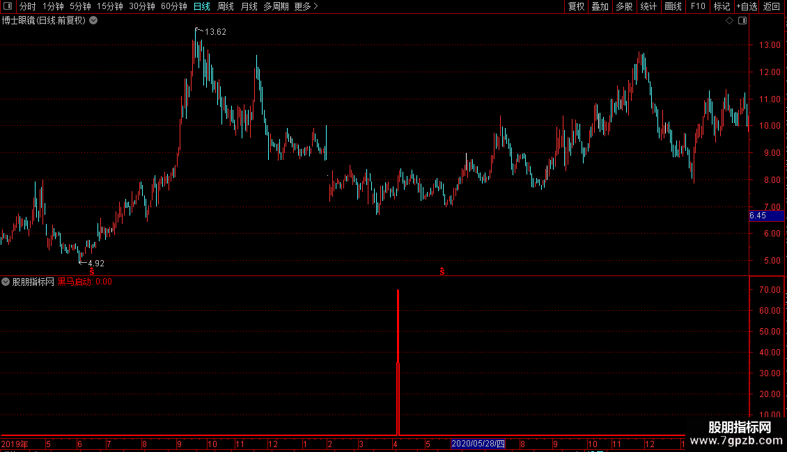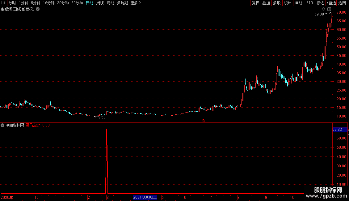 黑马启动:IF(CROSS(行情线,中线止损线) AND C/REF(C,1)>1+0.01*C AND 中线止损线<长线止损线,70,0),COLORRED,LINETHICK2;
