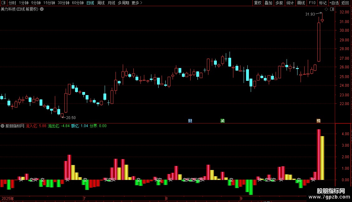 流出亿:IF(CLOSE>OPEN,0-VAR1*((HIGH-CLOSE)+(OPEN-LOW)),IF(CLOSE<OPEN,0-VAR1*(HIGH-LOW),0-AMOUNT/2))/100000000,COLOR00FF00,NODRAW;
