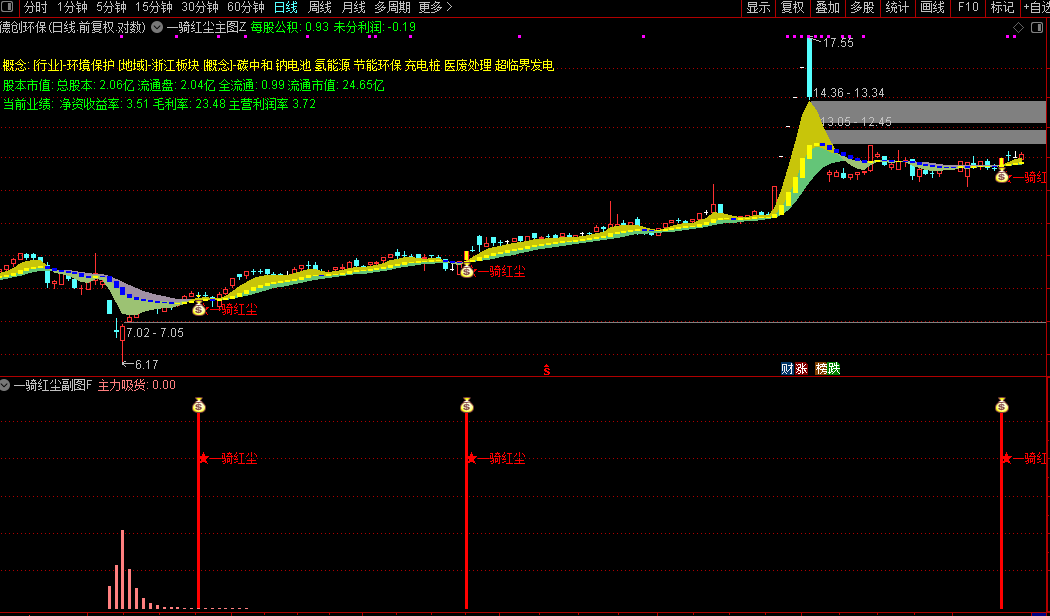 1 主图黄色柱提示向上趋势+副图提示有主力吸货,当有主力吸货后出现"一骑红尘"的信号,意味着即将起飞,可低吸介入。