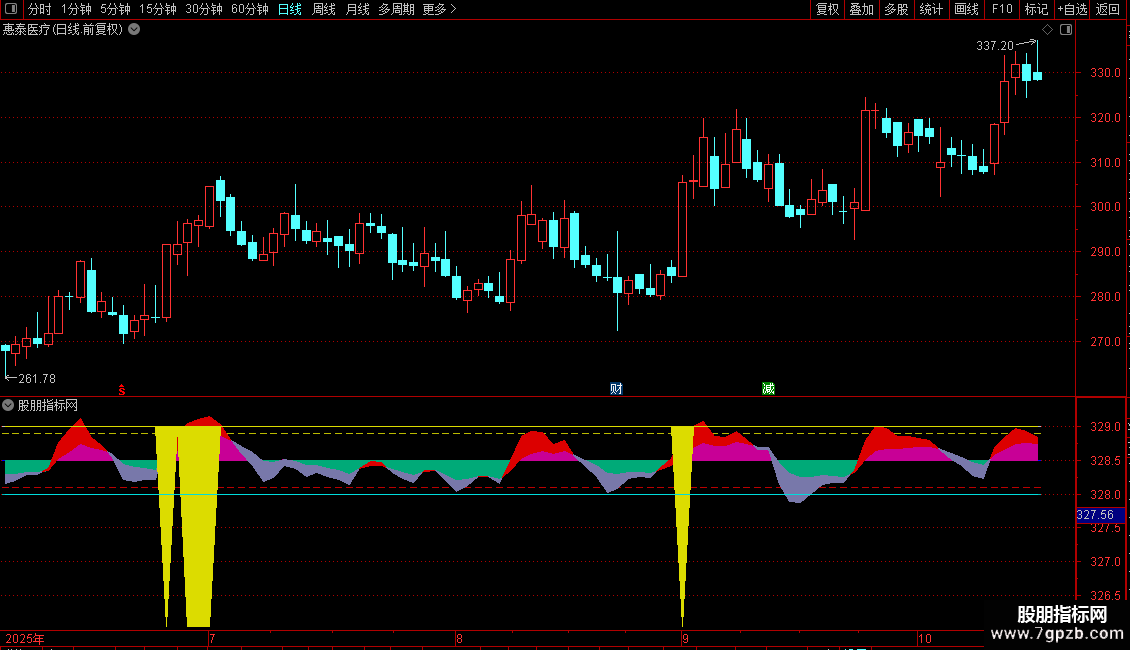 指标通过计算价格在特定周期内的相对位置,识别市场趋势和买卖信号。它在当前价格上下绘制多条水平参考线和彩色带状区域,直观展示支撑阻力位。当快线突破慢线时产生买入信号,下穿时则考虑卖出。