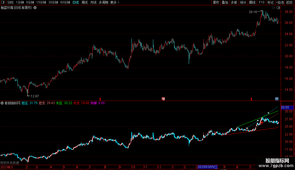 输出长压:当满足条件DD1时,在最高价位置画直线起点,当满足条件FF1时,在最高价位置画直线终点,1表示是否延长.,画绿色 线宽为1