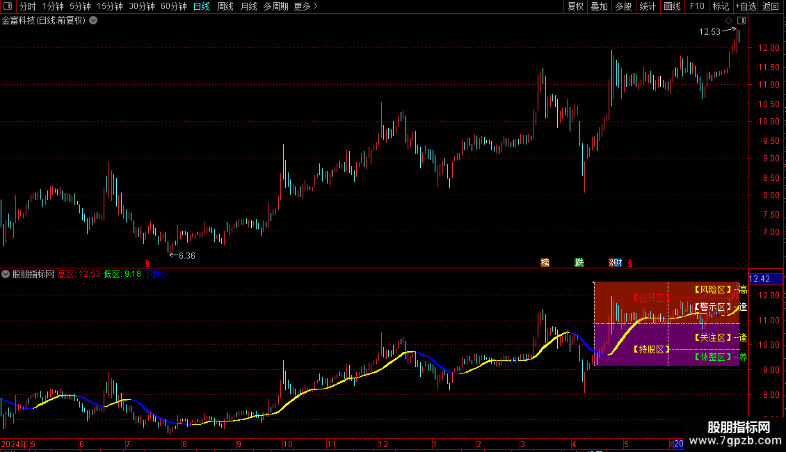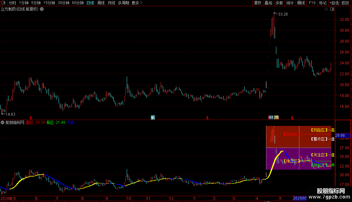 DRAWTEXT(CURRBARSCOUNT=N11/4+5,GD-KJ*0.09,'【风险区】--高抛避险'),COLOR00FFFF;