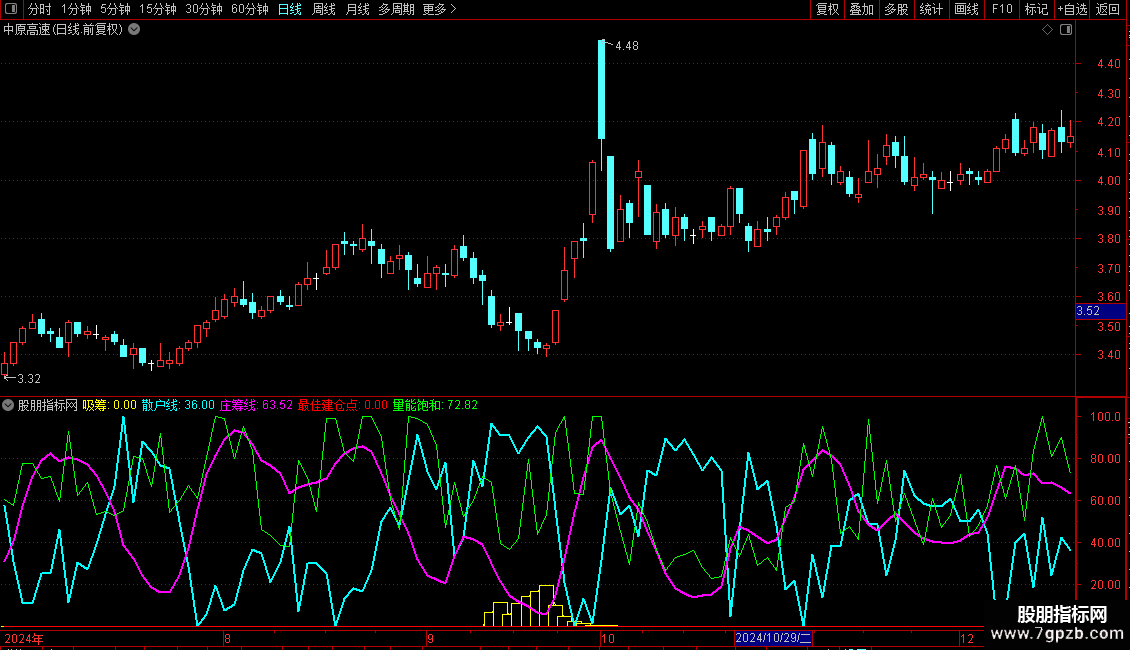 量能饱和:IF((AMOUNT/C)/(HHV(AMOUNT,20)/HHV(C,20))*100>100,100,(AMOUNT/C)/(HHV(AMOUNT,20)/HHV(C,20))*100),COLOR00FF00;