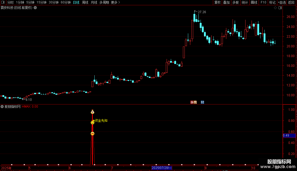 DRAWTEXT(HMAX,0.8, '★资金先知'),COLORYELLOW LINETHICK6;