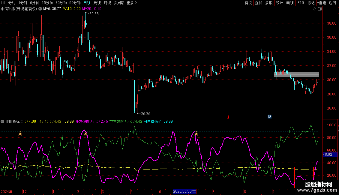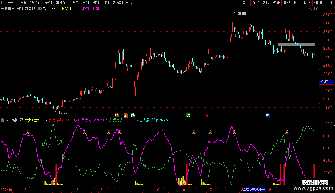2.紫色主力吸筹线低位震荡配合红色量能柱出现,构成日内见底信号,此时适合分批低吸布局。