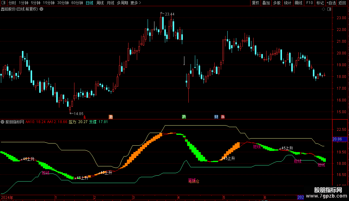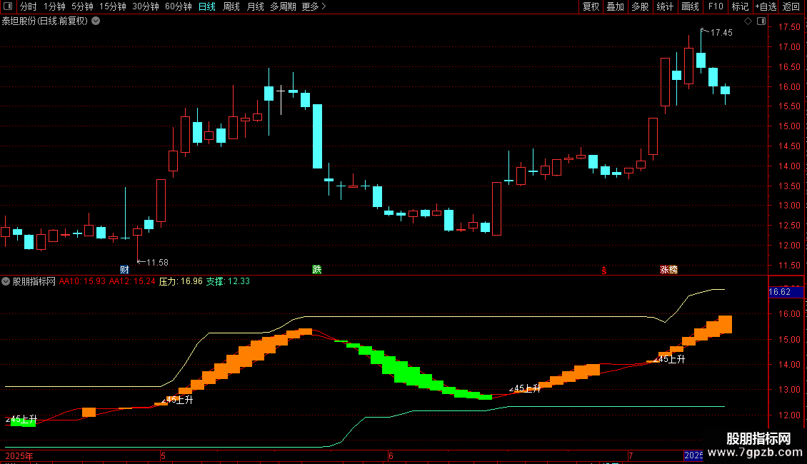 EMA8,'∠45上升'),COLORWHITE;压力:MA(REF(HHV(C,30),1),2),COLOR9DFFFF;