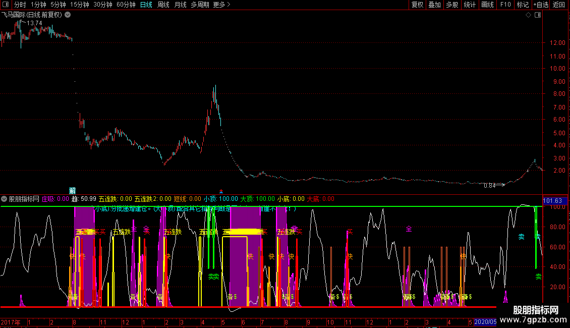五连跌2:IF(CONDTION_A AND CONDTION_B,70,0),COLORYELLOW,LINETHICK2;