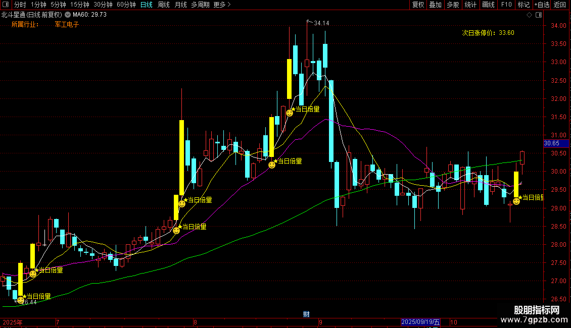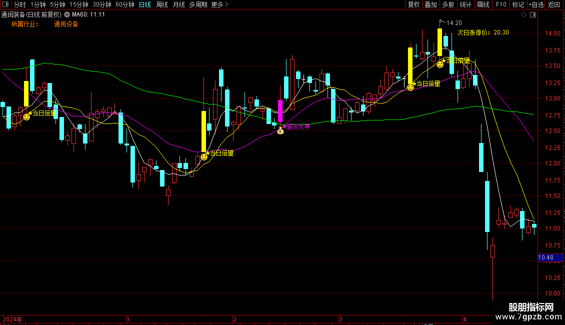 DRAWTEXT(倍量条件 AND NOT(游资信号),L*1,' ★当日倍量'),COLORYELLOW;