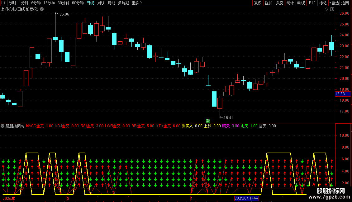 雨天:BARSLASTCOUNT(MACD金叉+KDJ金叉+RSI金叉+LWR金叉+BBI金叉+MTM金叉>0 AND MACD金叉+KDJ金叉+RSI金叉+LWR金叉+BBI金叉+MTM金叉<21 ),LINETHICK0;