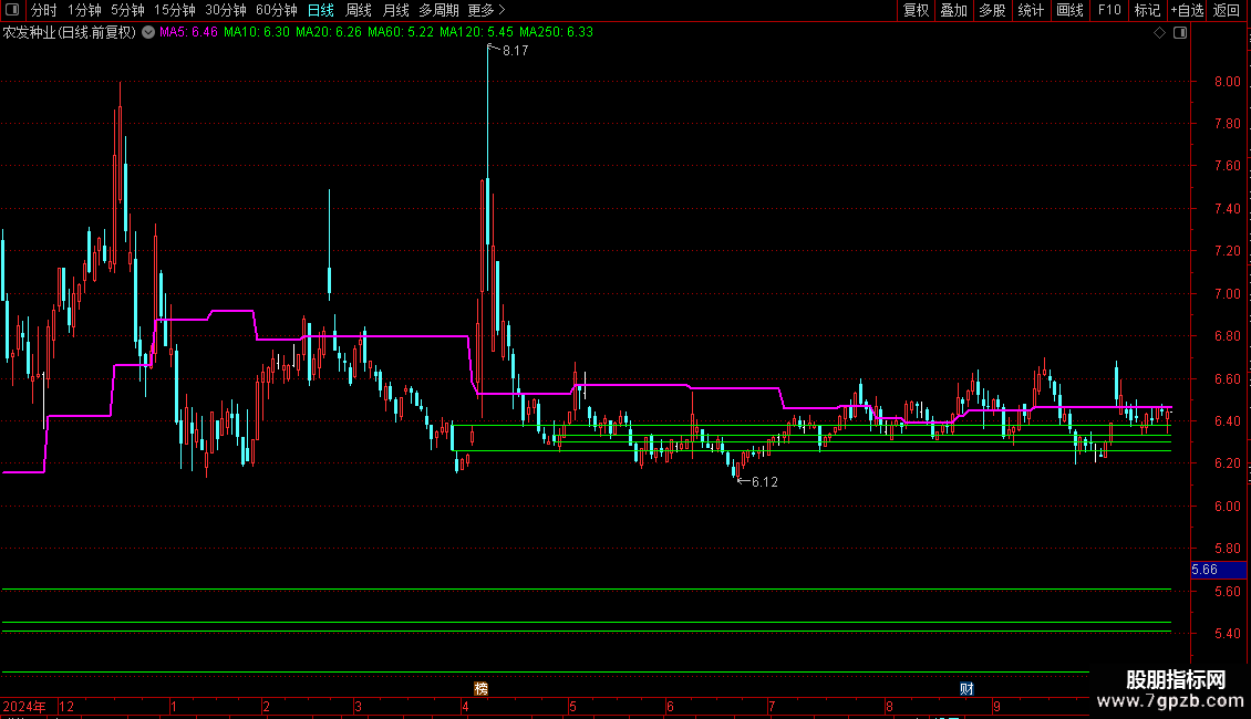 图中每条线都是压力线,相反每一条也是支撑线。指标在沙盘推演中,可以看到股价在一些压力点附近来回震荡,下跌过程中绿线成为支撑点,上涨过程中绿线就成了压力点。