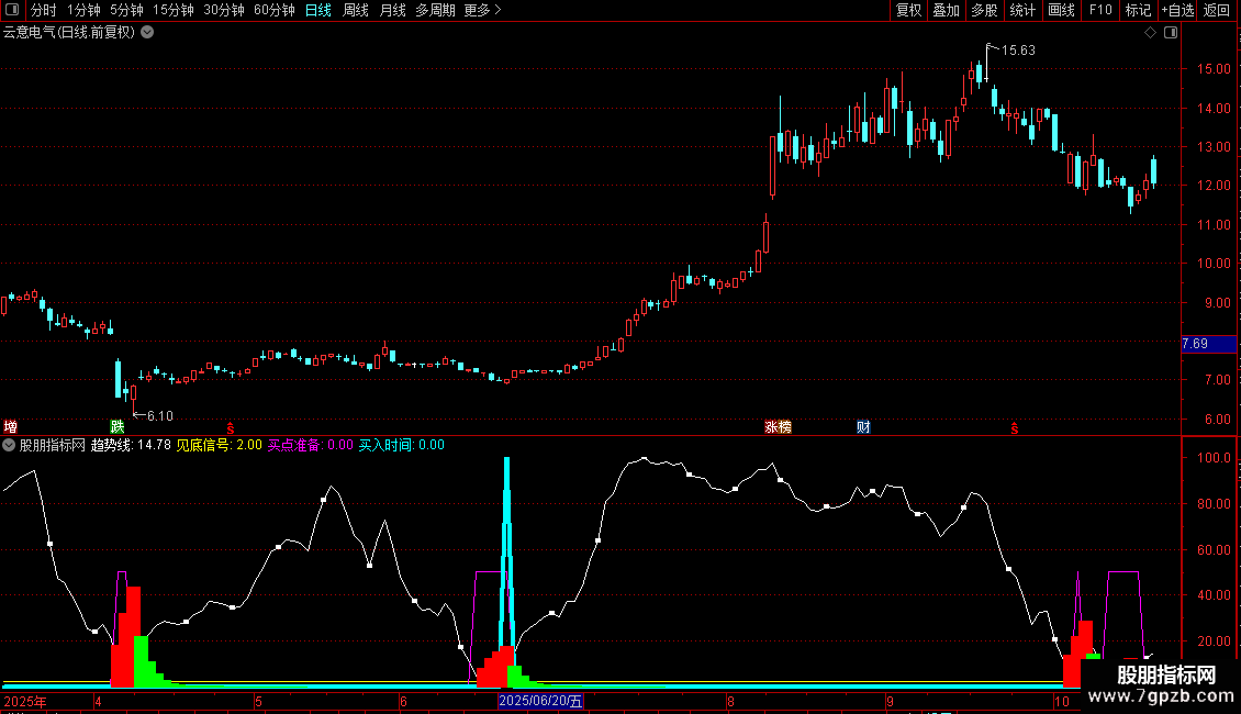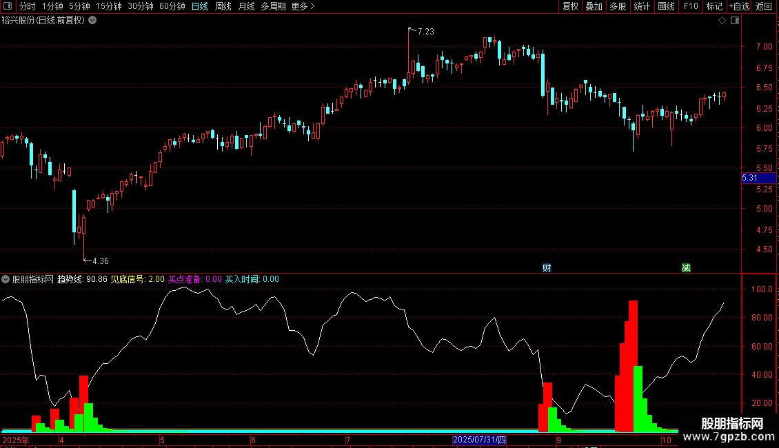 买入时间: IF(CROSS(趋势线,见底信号),100,0),COLORCYAN,LINETHICK4;