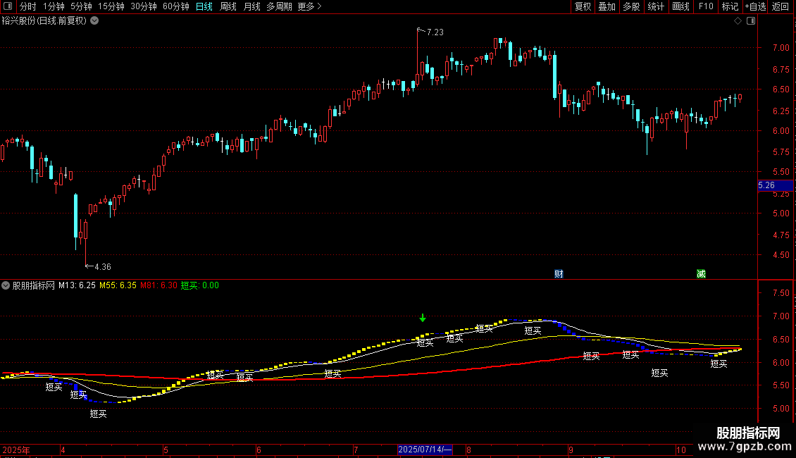 OPEN>REF(CLOSE,1),1,0),LOW,'买进'), COLORRED;