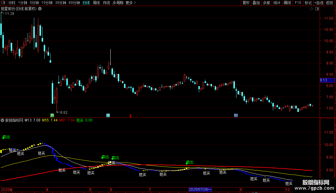 AND CLOSE<MA(CLOSE,13)*1.3,1,0),LOW,'抄底'),COLORRED;