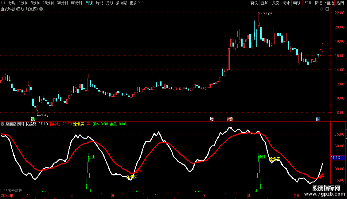 逢低买: DRAWTEXT(REF(CROSS(趋势线,长趋势),82) AND 趋势线>1.3*长趋势,长趋势,'逢低买'),COLOR00FFFF, LINETHICK1;