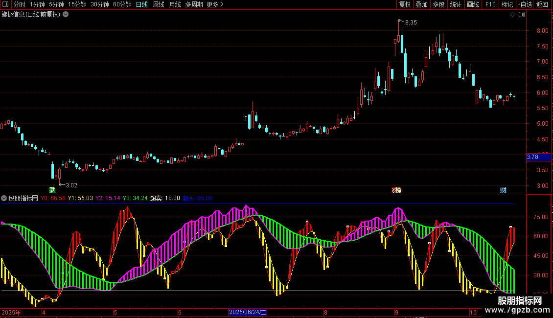 {粉红色柱子为主力控盘资金,粉红色柱子出现说明主力开始进场,粉红色柱子消失,说明主力出货完毕,粉红色柱子由长变短,说明主力小出货!}