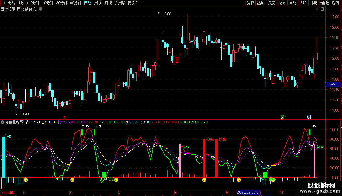 • 风险控制:指标在80附近设置“逃顶”信号(快线下穿90),及时提示超涨风险。