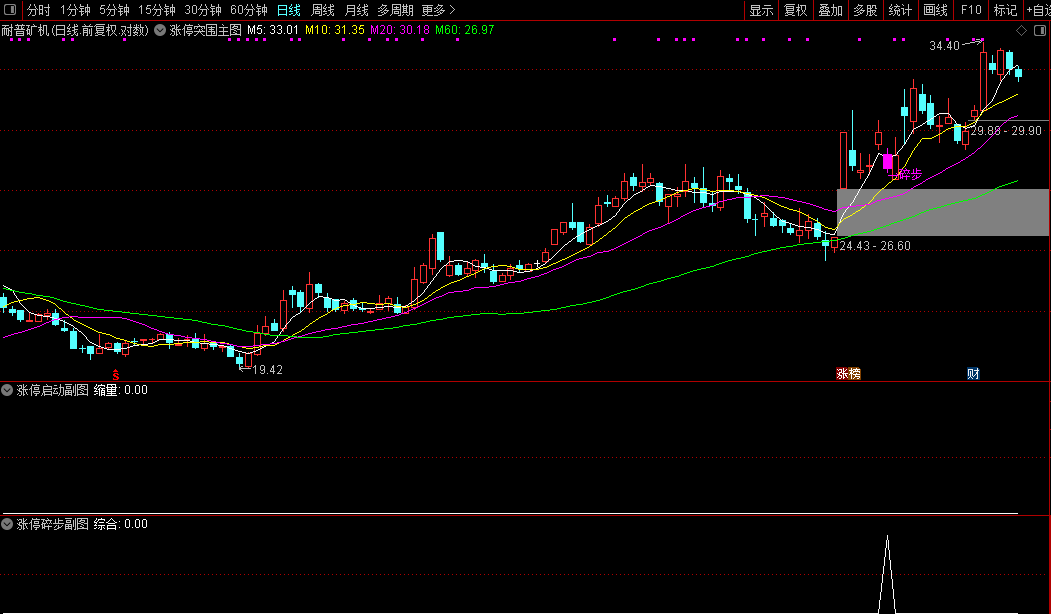 1.前期有过“强势启动”曾出现涨停,且涨停当天同时上穿5日、10日、20日均线(“突围),同时短期均线(5日、10日、20日)与中期均线(60日)高度粘合(“距离),说明启动时是“均线粘合后的突破”,爆发力较强。
