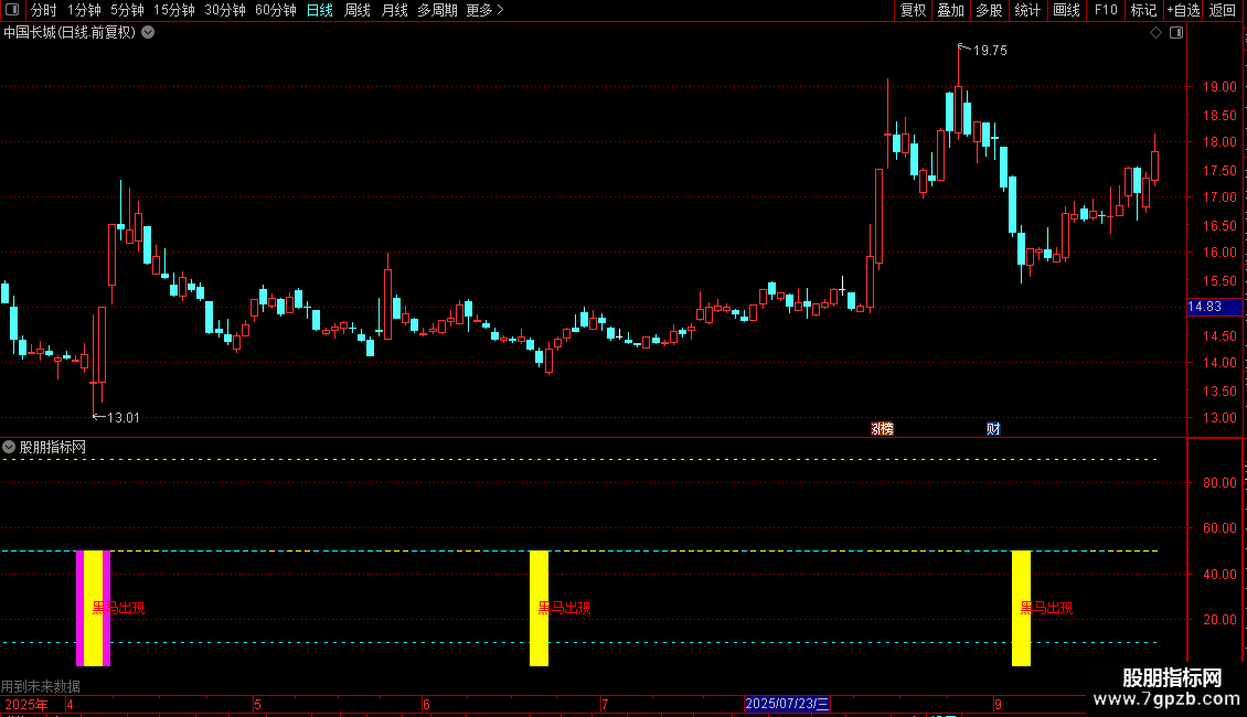 DRAWTEXT(FILTER(VARF=1,3),25,'黑马出现'),COLORRED ;