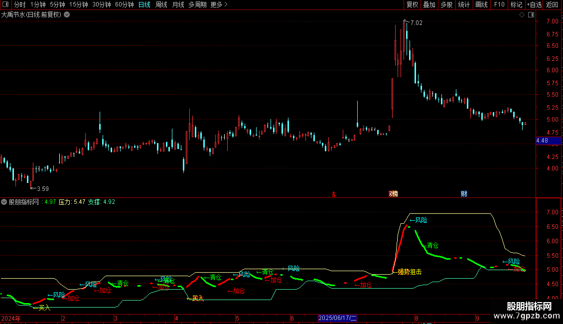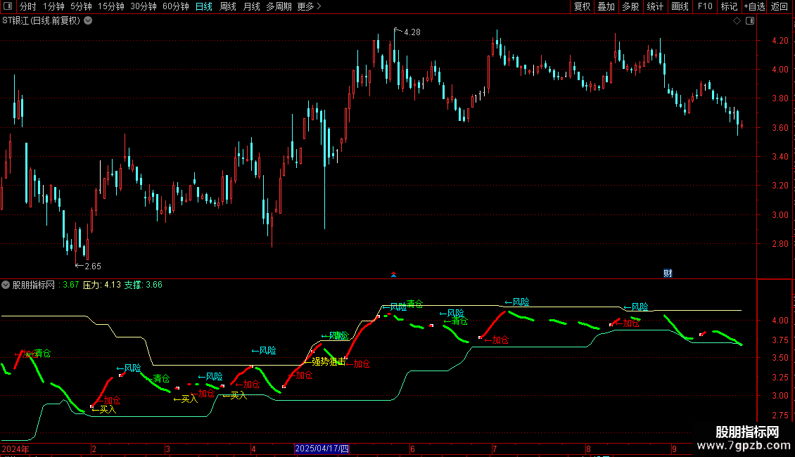 DRAWTEXT(减仓,HIGH*1.02,'←风险'),COLORCYAN;