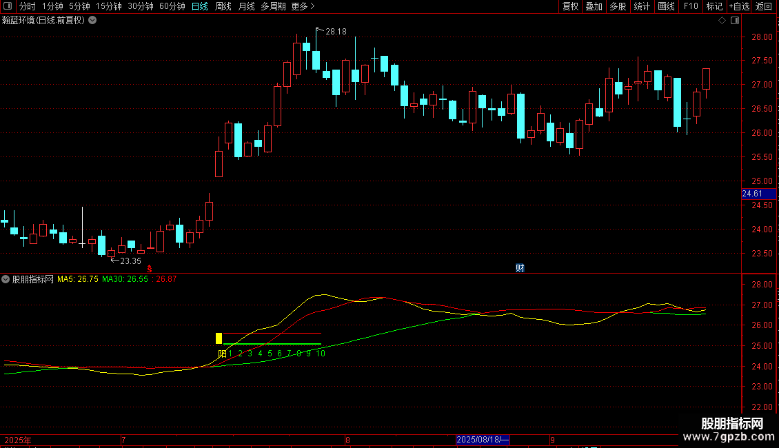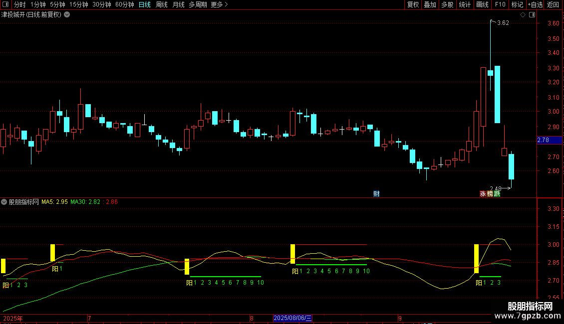 DRAWTEXT(BARSLAST(单阳)=7 AND 单阳不破,低不破价*0.98,'7'),COLORGREEN;
