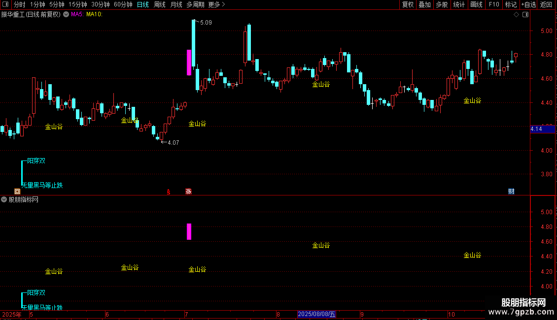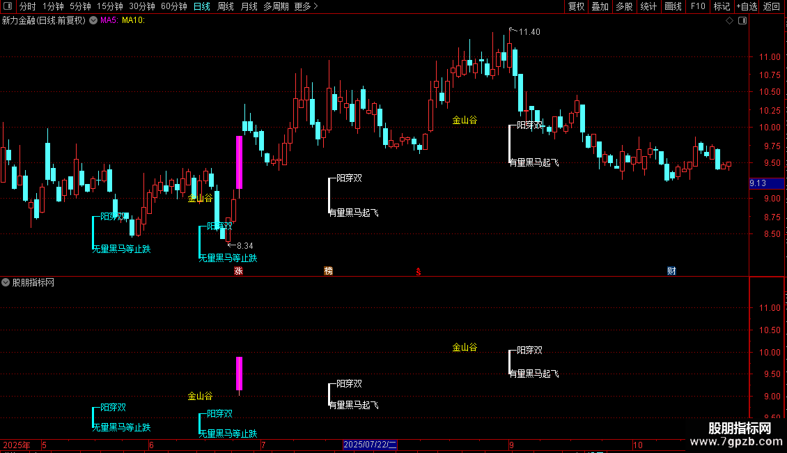 DRAWTEXT(山谷 AND MA(C,5)<MA(C,120),MA(C,30)-0.08,'银山谷'),COLORMAGENTA;