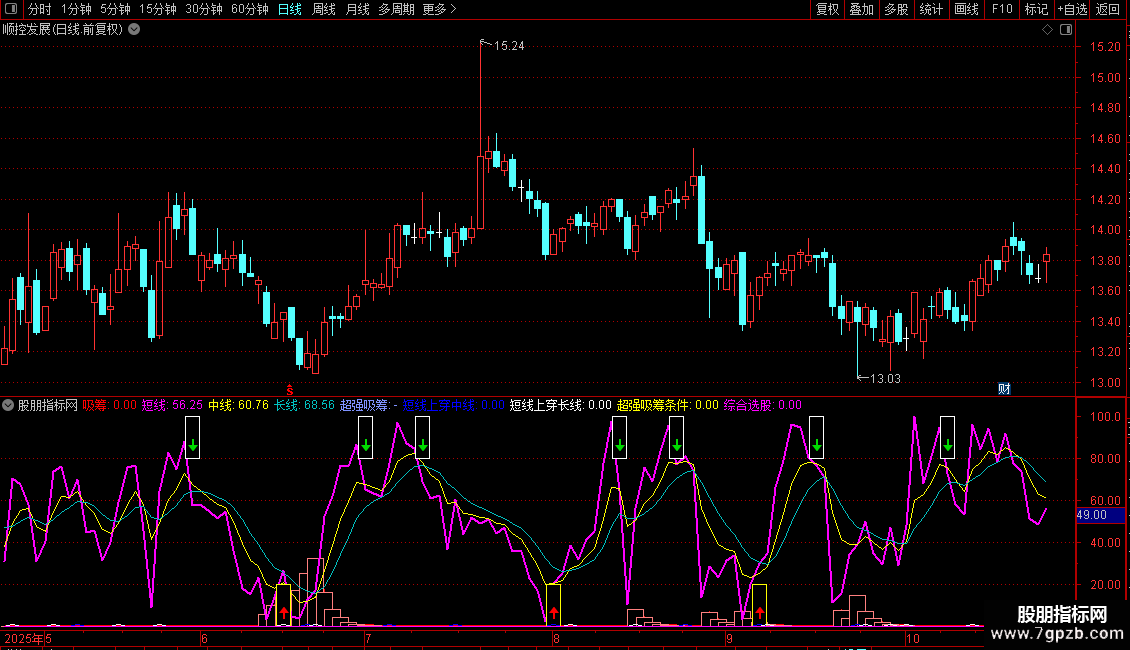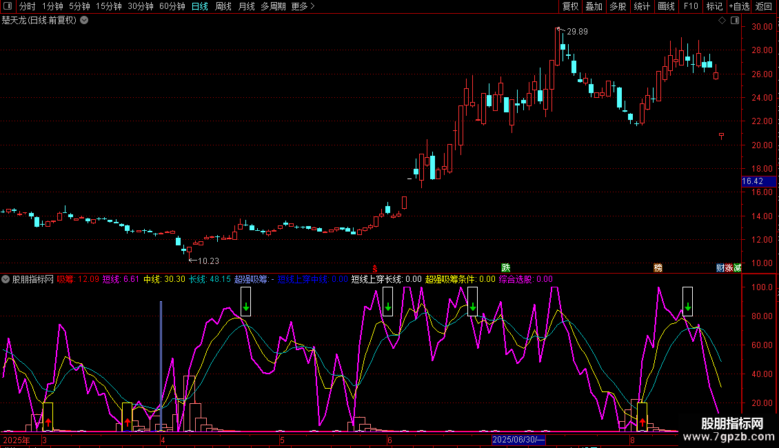 指标是一个多周期动能分析工具,主要功能是捕捉股票短期、中期、长期的动能变化,并结合“吸筹”信号辅助判断主力资金动向。其核心操作策略是:当短期动能线上穿中期线且“吸筹”指标显示主力资金介入时,视为买入信号;当短期线下穿中期线且动能处于高位时,视为卖出信号。指标还通过“超强吸筹”条件(如中期线上穿长期线且处于低位)强化底部确认,提高信号可靠性。
