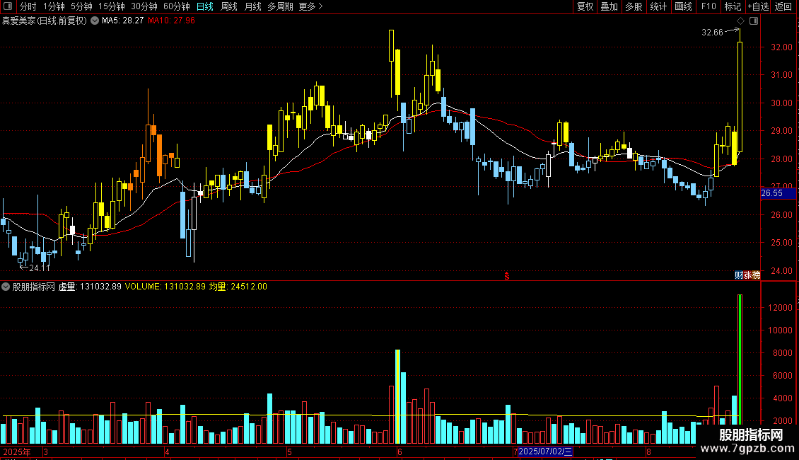 STICKLINE(VOL>=5*均量,0,VOL,1,0),COLORGREEN;
