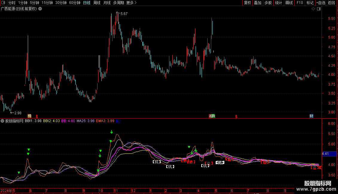 坑:DRAWTEXT(MDI>35 AND HHV(PDI,T253)>=30 AND HHV(BB,TBB)/L>1.10 AND J<10,L*0.99,'【坑】');