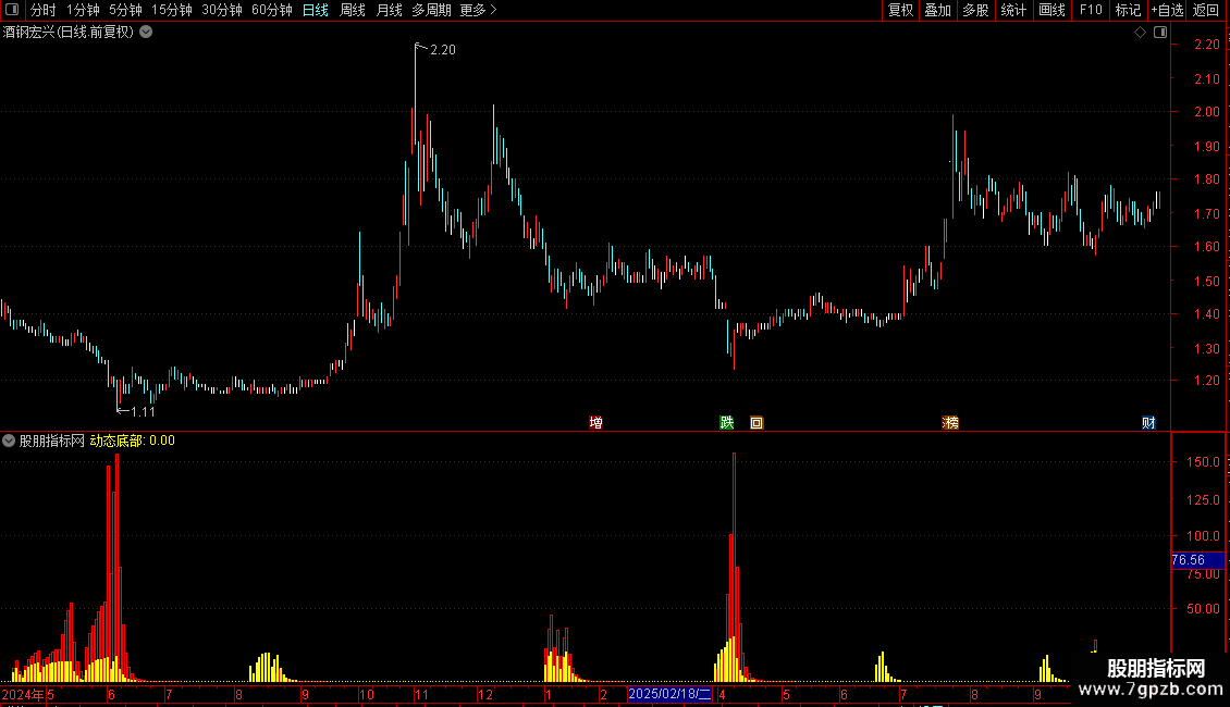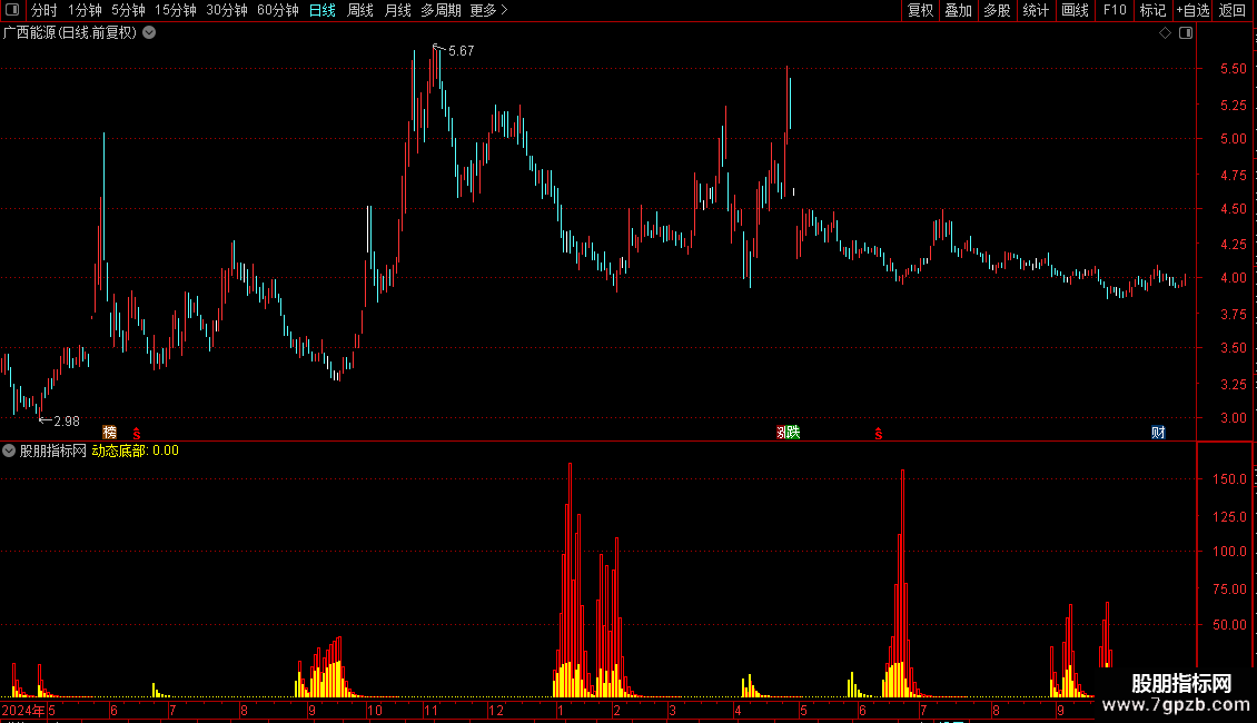 动态底部:EMA(IF(L<= LLV(L,30),SMA(ABS(L-REF(L,1)),30,1)/SMA(MAX(L-REF(L,1),0),30,1),0),3)*10,STICK,COLORYELLOW,LINETHICK2;