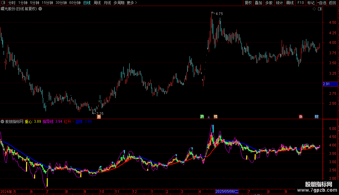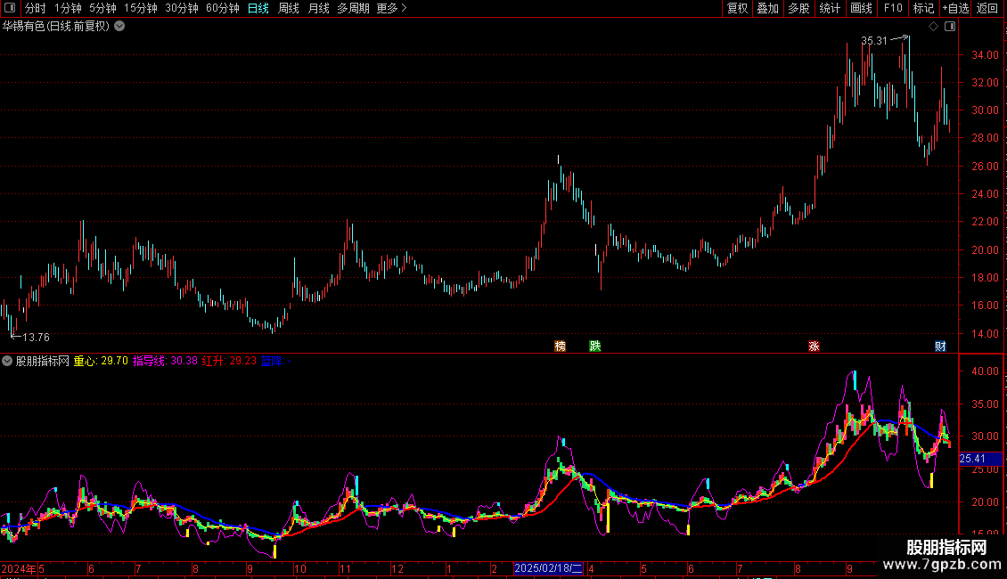 指导线:重心+GAO*(RSI-0.5),COLORMAGENTA,LINETHICK1;